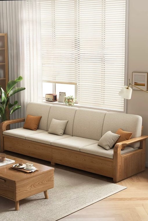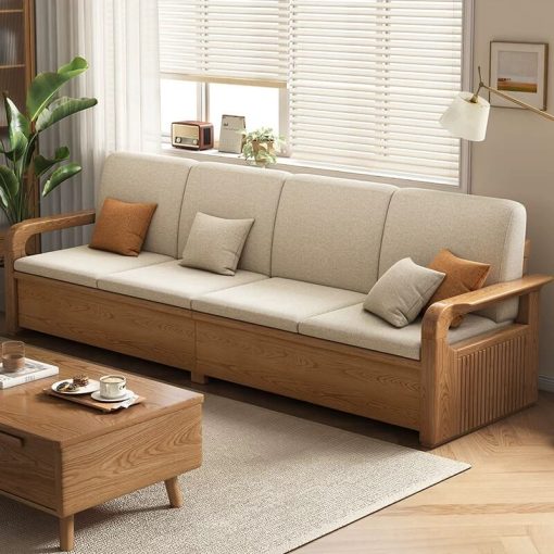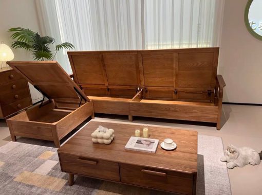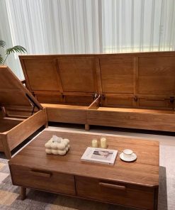 Điểm nổi bật của bộ sofa này chính là phần ngăn ẩn dưới ghế. Chỉ với một thao tác đơn giản, bạn đã có ngay không gian lưu trữ rộng rãi để cất giữ chăn gối, sách báo hay các vật dụng nhỏ. Điều này giúp phòng khách luôn gọn gàng, ngăn nắp mà không cần thêm tủ kệ cồng kềnh.