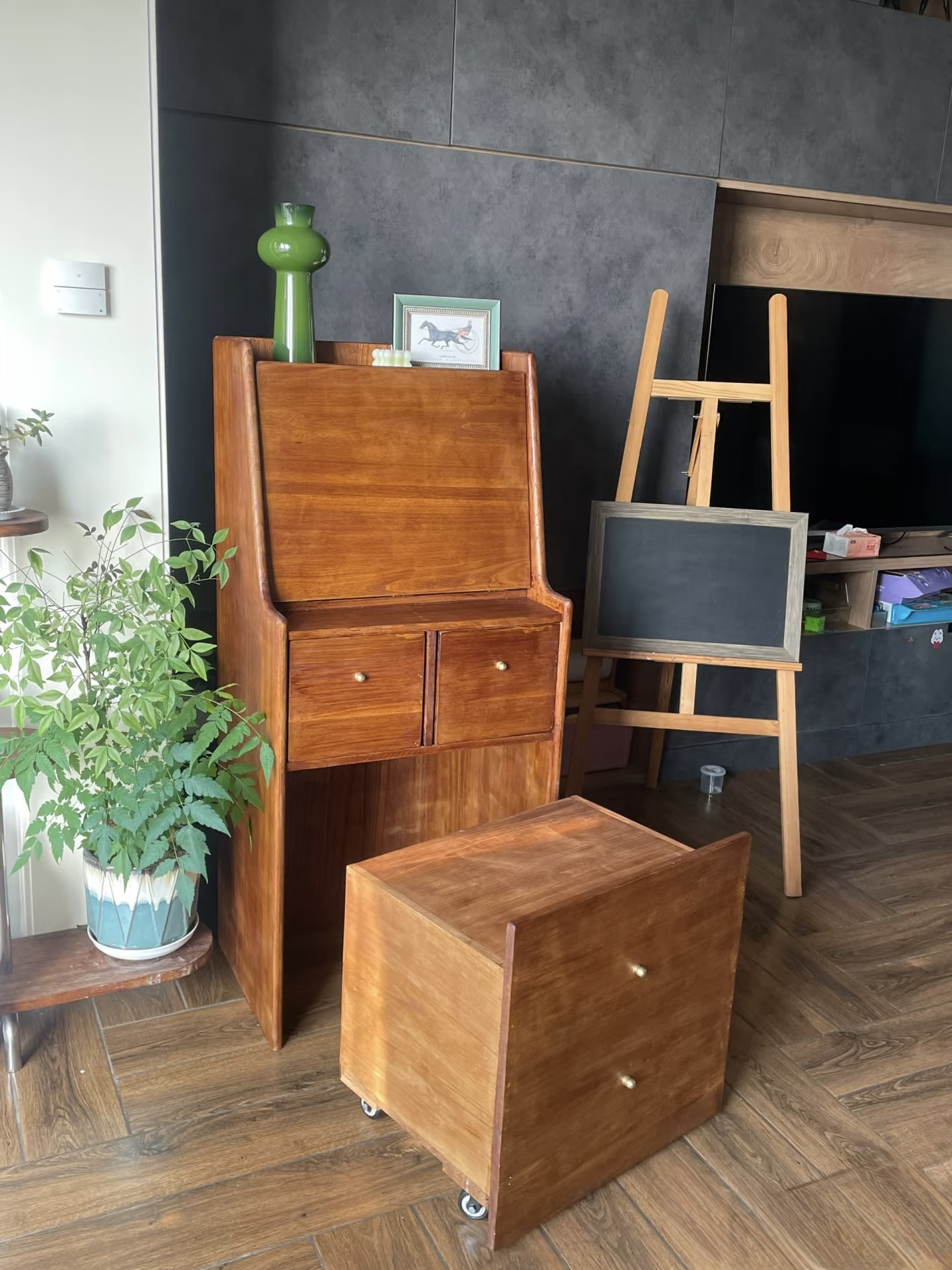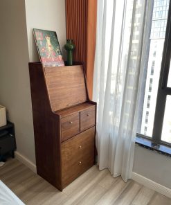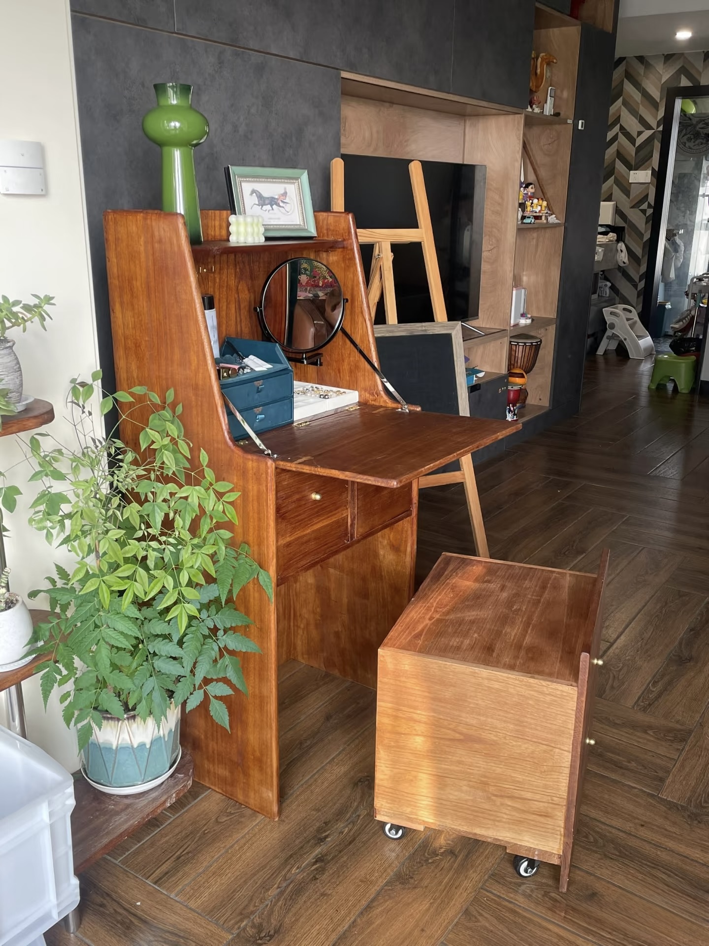 - Khi mở ra, bề mặt gỗ trở thành bàn trang điểm rộng rãi, chắc chắn.